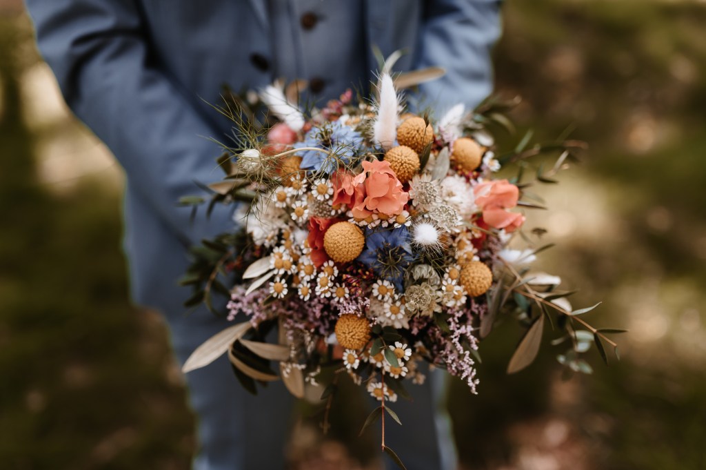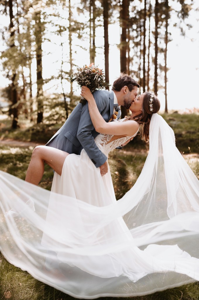 Das darauffolgende Shooting im Wald brachte uns schöne Erinnerungsfotos, auch wenn ich sagen muss, dass ich mit meinem Kleid (das doch schon weniger Stoff hatte als vielleicht andere Brautkleider) etwas zu kämpfen hatte im Gebüsch…aber was macht man nicht alles für tolle Fotos. Der Vormittag verflog und nach einer kleinen Stärkung ging es für meinen Mann auch schon in unserer Kutsche „aka roter VW Käfer“ zurück zur Location. Dort wurde er auch schon von einigen Gästen empfangen, die sich – so habe ich rückwirkend dann erfahren – doch gefragt haben, wo die Zeremonie stattfinden wird.