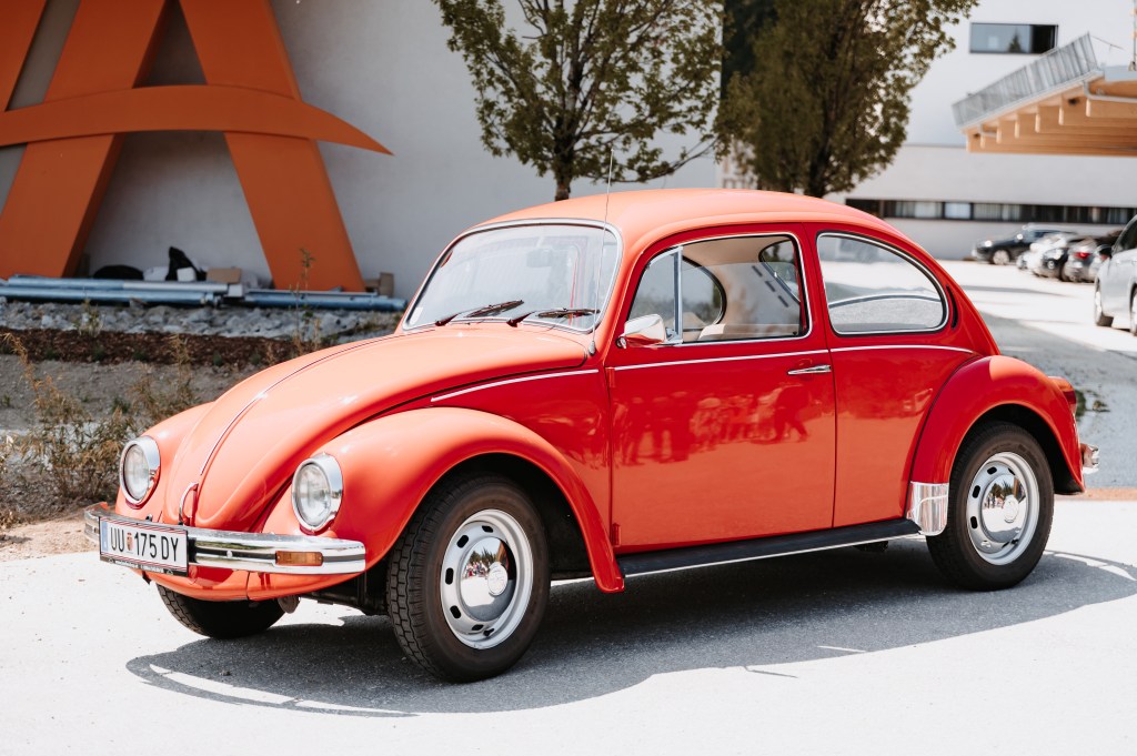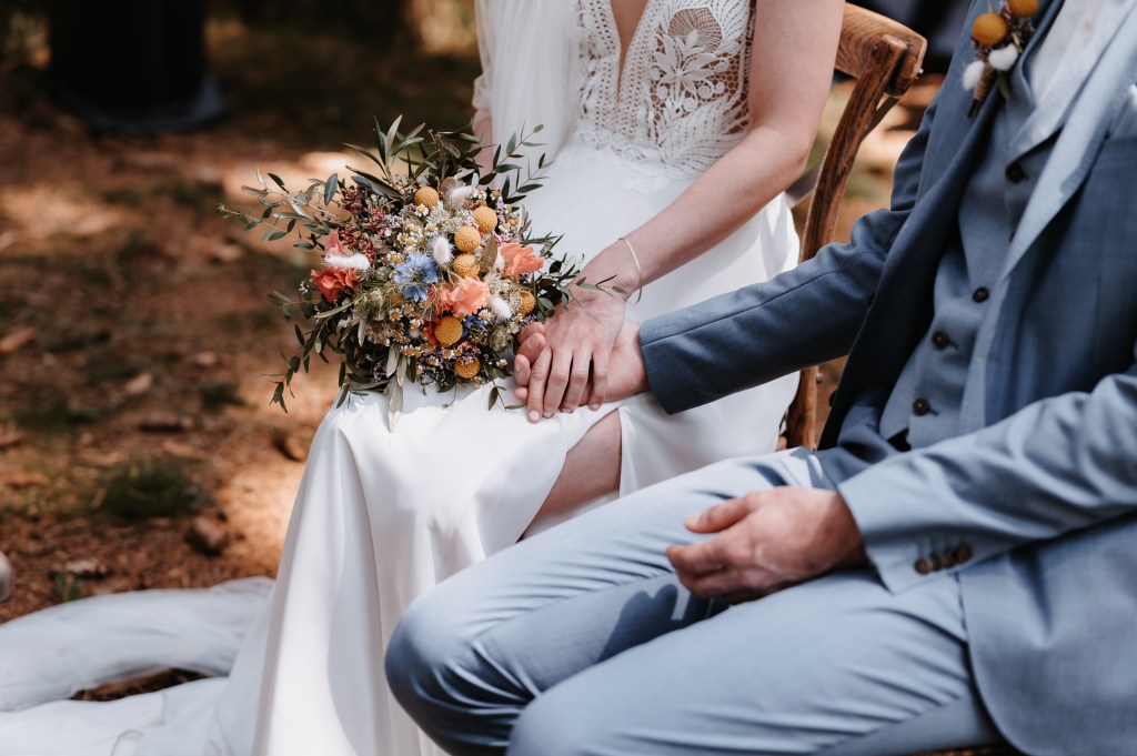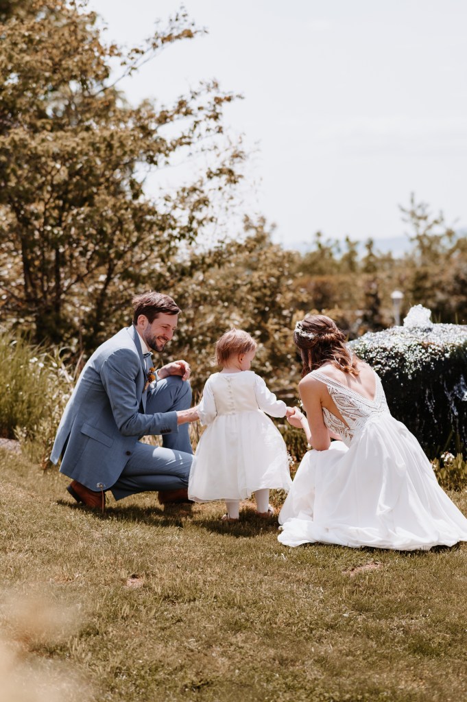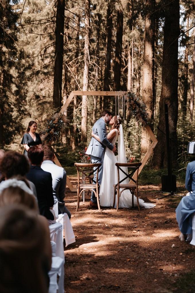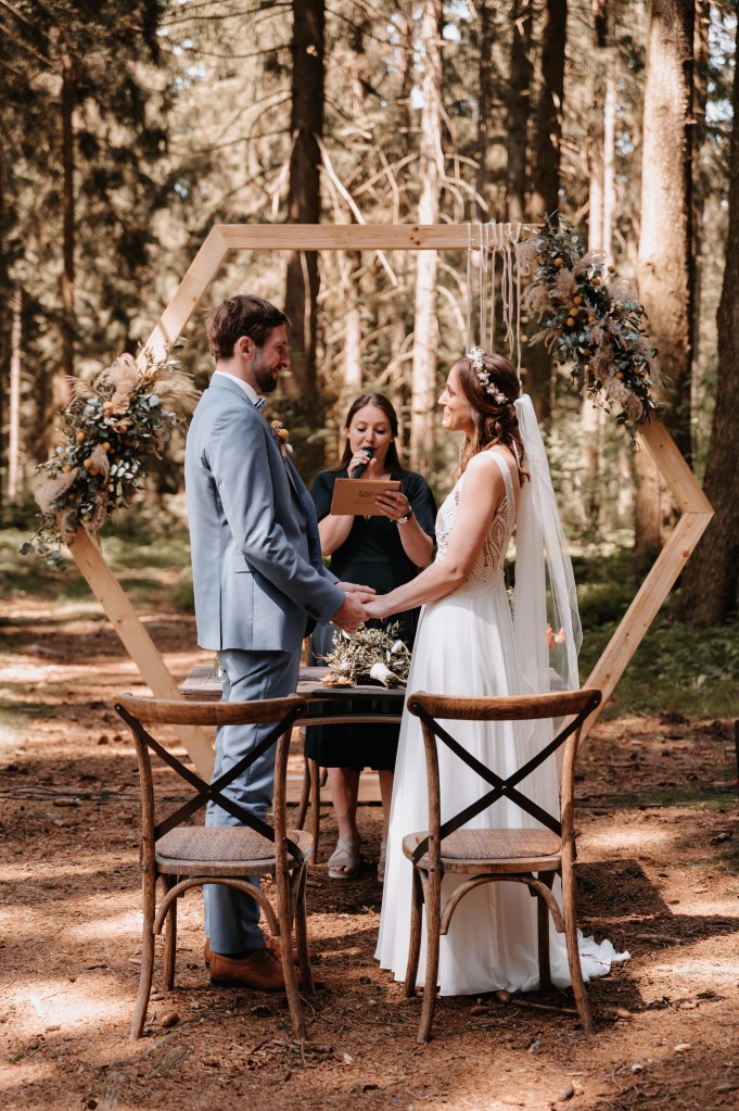 Ich kam dann erst kurz vor der Zeremonie bei der Location an. Auch ich wurde kutschiert, im roten VW Käfer. Gefahren wurden wir von meinem Cousin, der für mich wie ein kleiner Bruder ist und auch der Taufpate unserer kleinen Maus. Der VW Käfer – ein Erbstück meiner Familie. So war auch irgendwie mein Urli-Opa anwesend. Ich wollte unbedingt, dass mich die Gäste erst sehen, wenn wir im Wald einziehen. Mit unserem Blumenmädchen voran ging es für uns los. Schritt für Schritt. Seite an Seite.